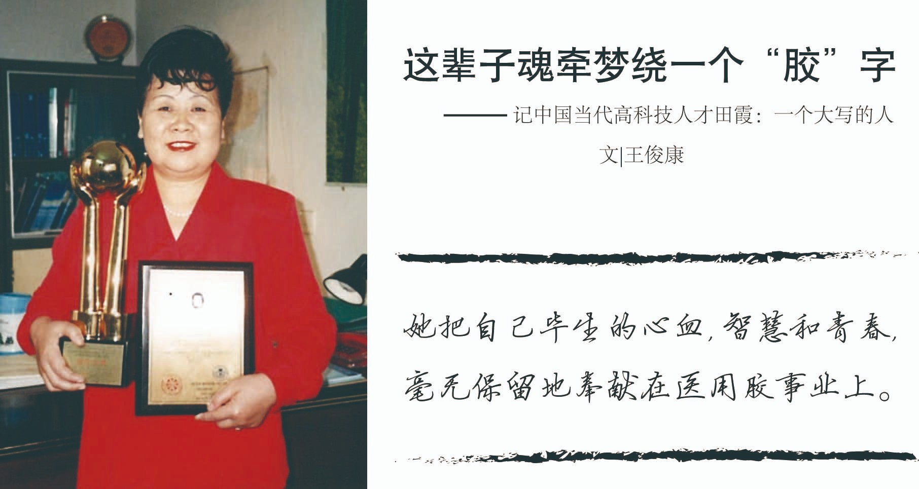 2021这辈子魂牵梦绕一个“胶”字她把自己毕生的心血、智慧和青春,毫无保留地奉献在医用胶事业上,“十年磨一剑”精神已让人感叹不已,更何况“四十年磨一胶”,说来真让人动容。查看更多> -