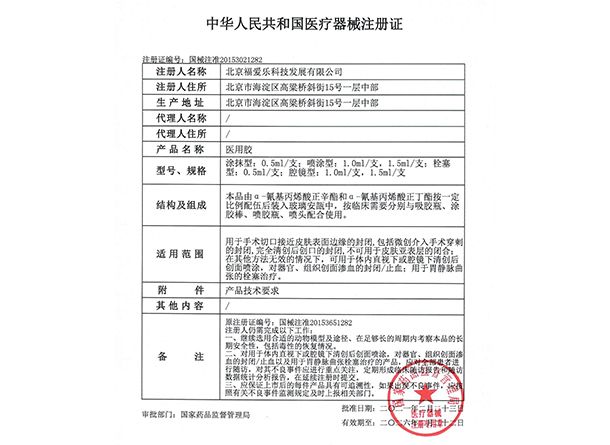 2021热烈祝贺“福爱乐医用胶产品注册证”成功延续注册2021年,福爱乐医用胶产品“中华人民共和国医疗器械注册证”成功延续注册,注册证编号:国械注准20153021282。查看更多> -
